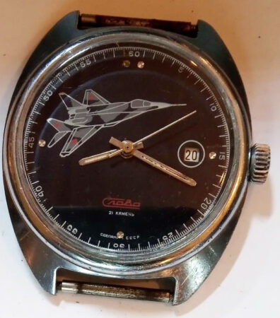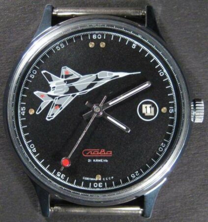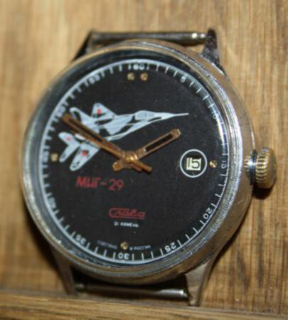 Montre bracelet, mécanique, à simple tantième, pour l’exportation, de la 2e Fabrique de Montres de Moscou, représentant un chasseur Mig-29.