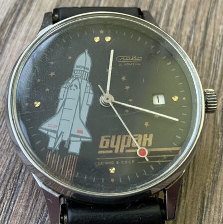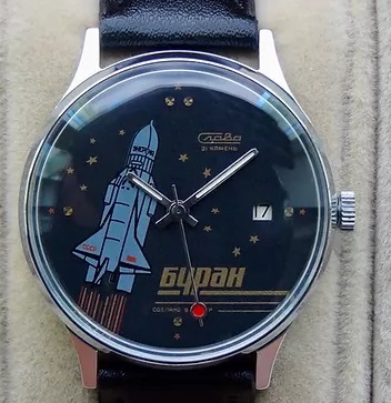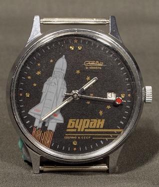 Montre bracelet, mécanique, à simple tantième, pour l’exportation, de la 2e Fabrique de Montres de Moscou, représentant la navette spatiale « Bourane » sur son lanceur « Energia »