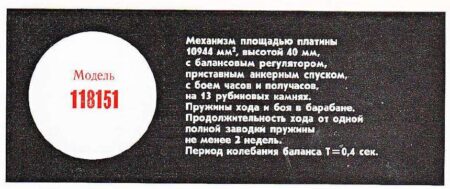 Mécanisme de pendule de la Fabrique d’Horloges d’OrelD’abord désigné ЧMC-28M, ensuite 11815113 rubisDimensions: 10944mm²Profondeur: 40mmPériode d’oscillation: 0.4 sec.