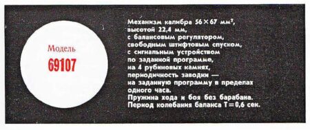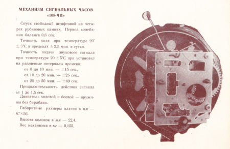Mécanisme de minuteur de la Fabrique d’Horloges d’Orel.D’abord désigné 108-ЧП, ensuite 69107.4 rubis67mm x 56mm x 22,4mmPériode d’oscillation: 0.6 sec.Au catalogue 1959: