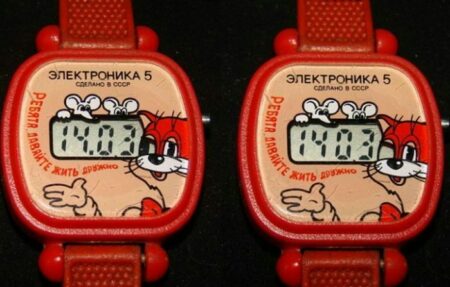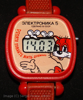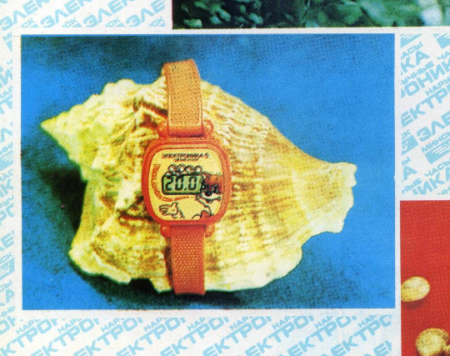 Montre bracelet à quartz et LCD (écran à cristaux liquides) pour enfant, produite par la Fabrique Elektronika du Combinat électronique « Integral », à Minsk.