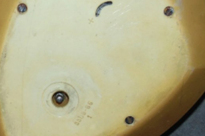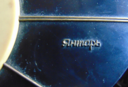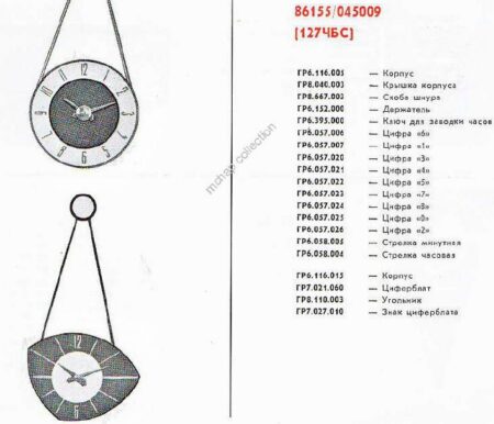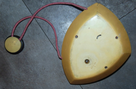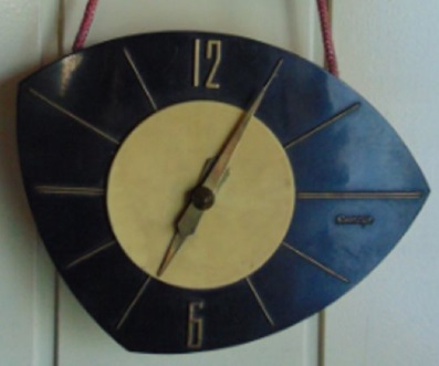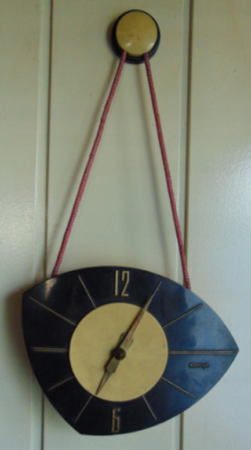 Horloge murale de la Fabrique d’Horloges d’Orel.Marque: YantarAnnées ’70Mécanisme: 86155Boîtier de bakelite avec un montage en laitonL’horloge est suspendue à une cordeDimensions: 45cm x 23,5 cm