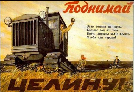 La le programme sur « L’irrigation et la valorisation des Terres vierges » a été décidé 16 août 1954. Plus de 1,5 millions de personnes sont alors parties pour les steppes du Kazakhstan, la région de la Volga, la Sibérie et l’Oural pour y mettre en culture céréalière près de 45 millions d’hectares. 300.000 Komsomol partent comme volontaires pour le seul été ’54. Près de 1,7 millions de personnes ont pris part à ce projet dans les années 1950.