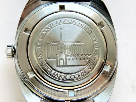 Montre officielle offerte aux délégués du 26e Congrès du Parti communiste de l’Union soviétique. Le 26e congrès s’est tenu à Moscou du 23 février au 3 mars 1981. Le fond montre la tour Spasskaya et le Palais des Congrès du Kremlin et porte la mention « XXVI съезд КПСС »