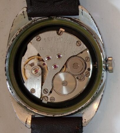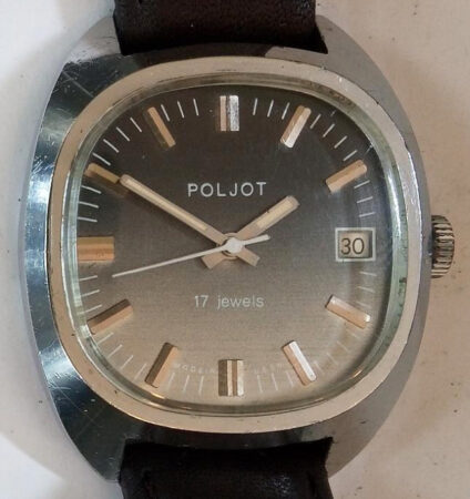 Mentions sur le calibre : dernier logo Poljot (couronne) sur la platine, SEVETEEN 17 JEWELS, SU, et 2614.2H sur le pont.