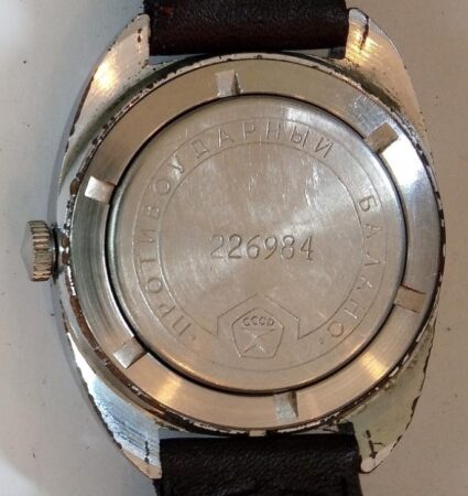 Gravure sur le fond : 226984, marque de qualité de l’URSS, et mention противоударные бaлaнз (mouvement antichoc)