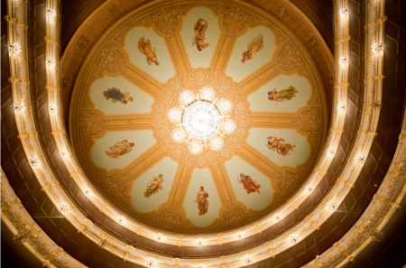 Un magnifique théâtre à huit colonnes avec le char du dieu Apollon au-dessus du portique, symbole du mouvement éternel de l’art et de la vie. Un bel édifice de style classique, décoré dans des tons rouge et or. Son ouverture eut lieu en janvier 1825. L’auditorium à cinq niveaux est réputé pour sa taille ainsi que son excellente acoustique. Il est parsemé de stuc doré et des peintures envahissent le plafond où descend un immense lustre en cristal à plusieurs niveaux.