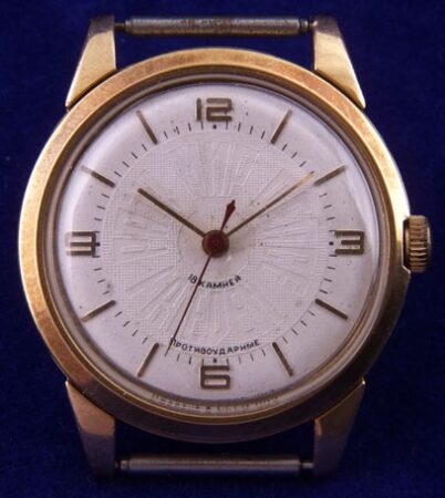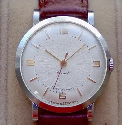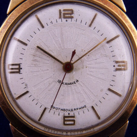Le cadran mentionne 18 камней et Противоударный (antichoc) et porte en relief le mot « paix en quatre langue (russe, français, allemand et anglais)