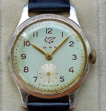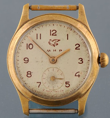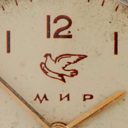 Montre bracelet de la 2e Fabrique de Montres de MoscouMarque Мир (Mir, « Paix ») avec le motif de la colombe de la paixLe boîtier est en aluminiumMécanisme: ЧK-11M (n° de série 43013).