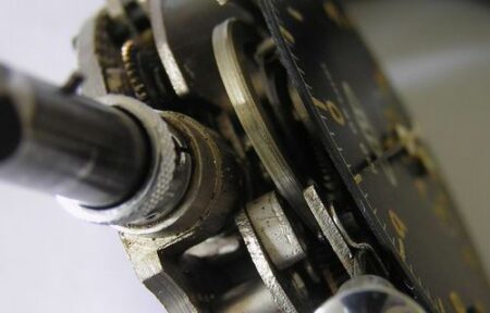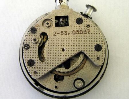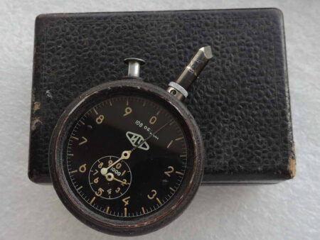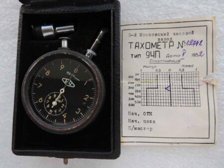 Il intègre un mécanisme d’horloge intégré, sur une ancre à broche. Il s’agit d’un dispositif permettant de mesurer la vitesse d’un arbre (par exemple, un moteur). Lorsque l’on appuie sur le bouton, il se met à faire tic-tac et compte les tours de l’arbre rotatif. Le mouvement de rotation est transmis au grand arbre, puis au dispositif de comptage avec l’aiguille par l’intermédiaire d’un engrenage à vis sans fin. Pour résoudre le problème du sens de rotation, un embrayage à roue libre est utilisé, comme dans un remontoir automatique moderne. Quel que soit le sens de rotation de l’arbre, l’aiguille se déplace dans le même sens.