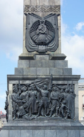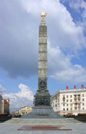 La ville de Minsk, capitale de l’actuelle Biélorussie, est encerclée par l’avancée des forces allemandes à la fin du mois de juin 1941. Pris au piège dans une vaste poche, les Soviétiques défendent farouchement leurs positions. Leur résistance est brisée le 9 juillet, et plus de 300 000 soldats soviétiques sont faits prisonniers. Pendant les trois années d’occupation qui ont suivi, les Allemands ont tué environ 400 000 civils dans la ville et ses environs. La région de Minsk est devenue le centre des activités des partisans soviétiques derrière les lignes ennemies. Minsk a reçu le titre de ville-héros en 1974.