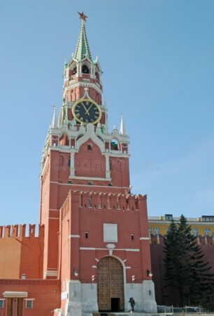 Haute de 70 mètres, la Tour Spasskaya (Спасская башня), appelée aussi en français la Tour du Saint-Sauveur, est considérée comme la tour principale du Kremlin de Moscou. Elle apparaît sur la place rouge et est visible de tous les côtés. La partie principale a été construite en 1491 par l’architecte italien Solario. Ogourtsov et l’Ecossais Christopher Galloway ajoutèrent la partie supérieure et le chatior en 1625. C’est Galloway qui supervisa l’installation de l’horloge.