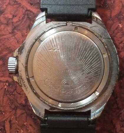 Gravure sur le fond : водонепроницаemye (étanche), soleil levant, mer et mouette, sans numéro