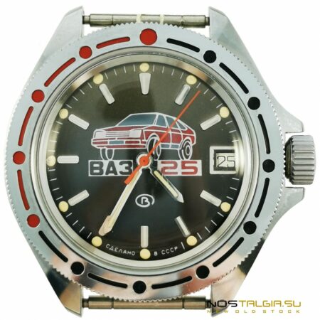 Mentions sur le cadran : ВАЗ 25 (pour les 25 ans de la Во́лжский автомоби́льный заво́д, Fabrique d’Automobiles de la Volga), le logo « Lada » de la fabrique.