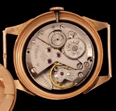 Mentions sur le calibre : n° de série (2435500) sur la platine, logo de l’usine (initiales 1MЧЗ dans un losange) et 16 камней (16 rubis) sur un pont, 1MЧЗ et trois étoiles sur le rochet.