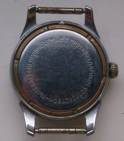 Gravure sur le fond : en cercle : устройством-пылевлагонепроницаемые с противоударным (dispositif antipoussière et antichoc), perlage à l’intérieur.
