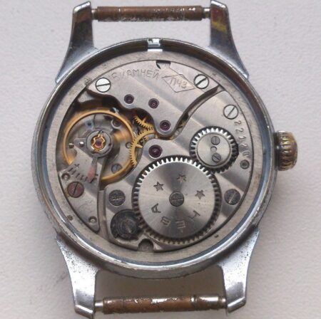 Mentions sur le calibre : 16 камней et logo de la fabrique (les initiales ПЧЗ inscrites dans un losange) sur un pont, trois étoiles et Нева sur le rochet.