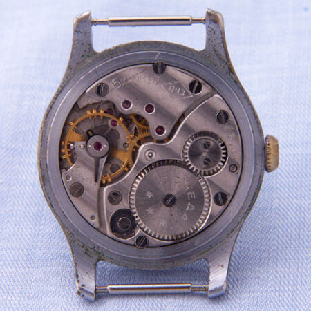 Mentions sur le calibre : 15 камней et logo de la fabrique (les initiales ПЧЗ inscrites dans un losange) sur un pont, trois étoiles et Pobeda sur le rochet, côtes de Genève.