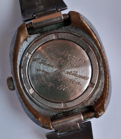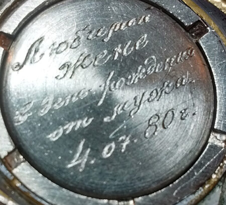 Gravure sur le fond : Любимой жене, В день рождения от мужа, 4.07.80г. (« À mon chéri, pour [le jour de] ton [on mari] anniversaire, le 04/07/1980).