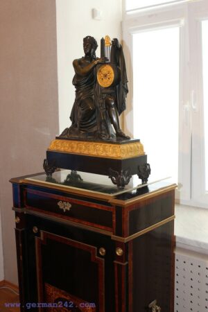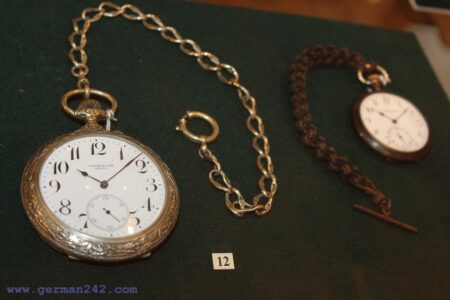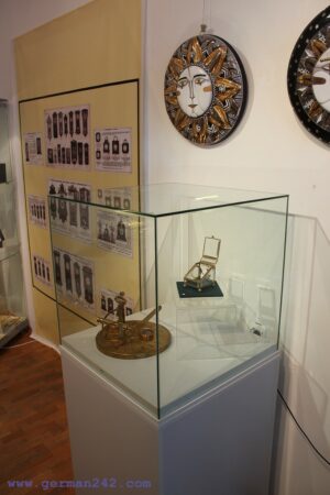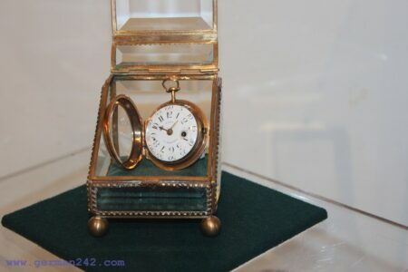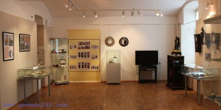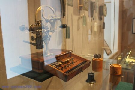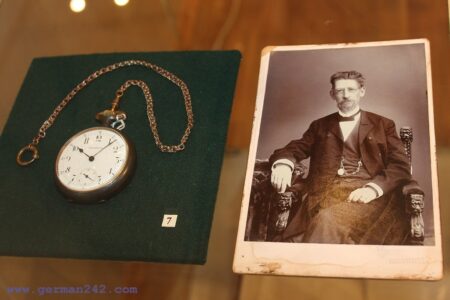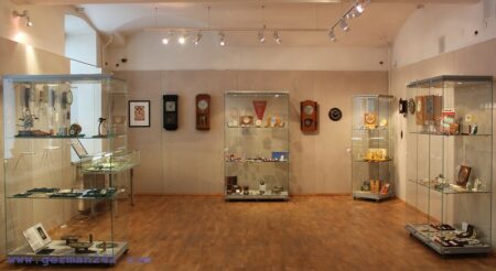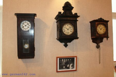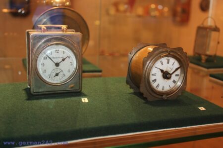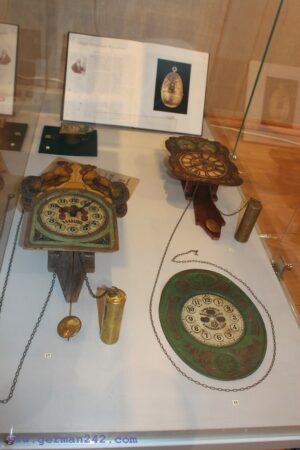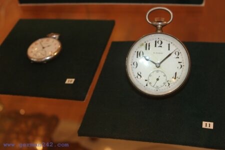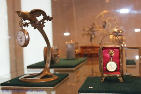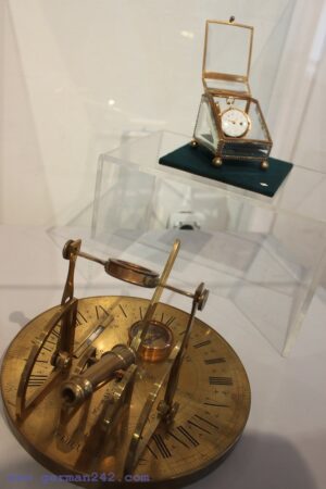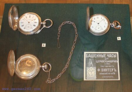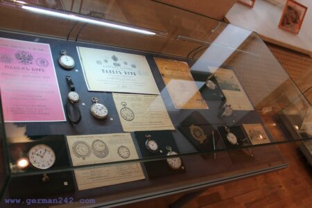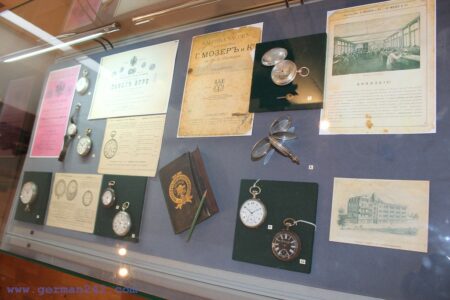 Un cadran solaire de la maison de commerce Tryndin (provenant des fonds du RIHM). Le canon d’alarme est chargé de poudre à canon et allumé par un rayon de soleil à travers une lentilleMontre de poche de la fabrique Marc Fazius, Moscou, 1773-1778Une simple horloge murale, et une photo d’une usine d’horloges près de Moscou datant de 1914Un stand consacré aux deux piliers de la distribution horlogère dans l’Empire russe – Pavel Bure, …… et Henry MoserOutil d’horlogerie ancien : machine à trépaner, jeu de poinçonsRéveils allemands, avec et sans marqueDes support de montres de poche, en fait, il y en avait un grand nombre.Horloge William Gaby, boule d’horloge de table, utilisée comme presse-papier.Maison du commerce des montres de Freimut, horloge et portrait du fondateurJosef Barzhansky, maison de commerce d’Odessa, montre de poche produite par la firme suisse Doxa.Horloges des ateliers V. Platov et J. Chmielewski, produite avant 1917. Le cadran porte des portraits de Nicolas II et de son épouse et des motifs rustiques.