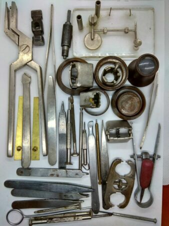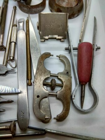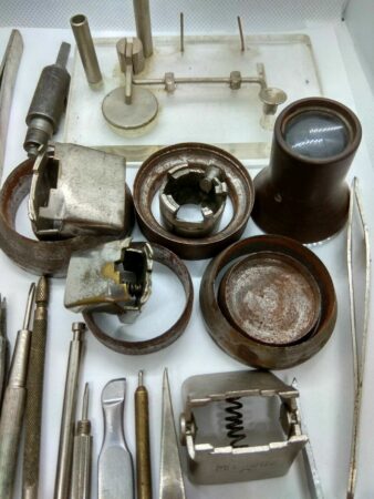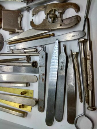 Lot d’outils horlogers soviétiques de diverses provenance dont la Fabrique de Montres d’Ouglich (une brucelle est estampée du logo « Tchaïka »).