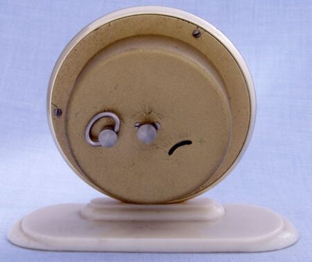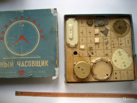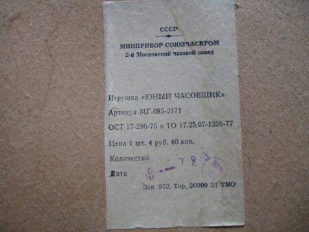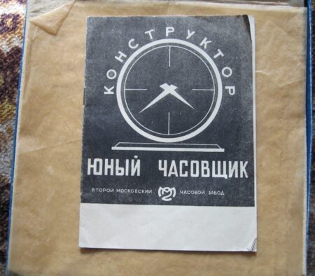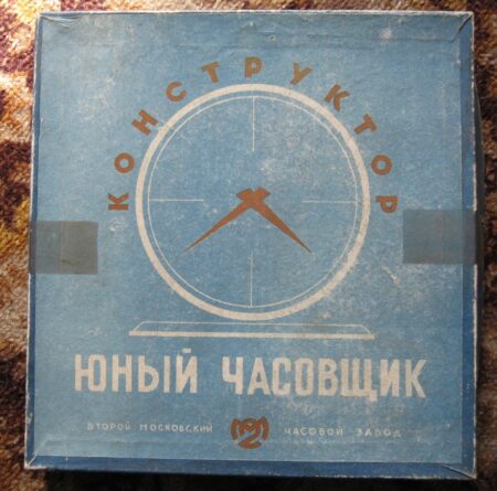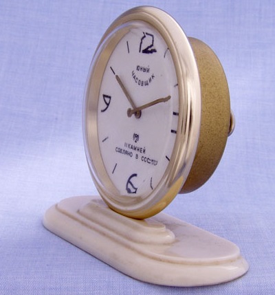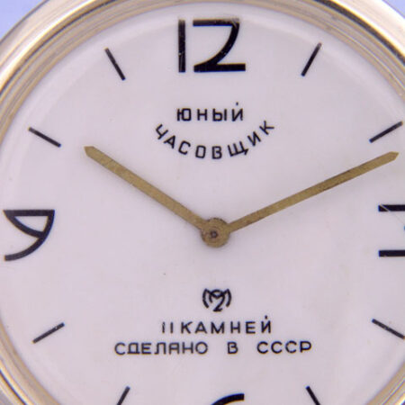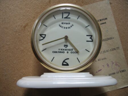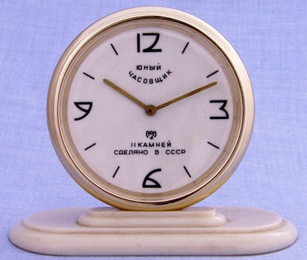 Pendulette de marque « Jeune horloger » (юный часовщик) de la 2e Fabrique de Montres de Moscou. Le mécanisme est probablement un 5671 à 11 rubis sans alarme.