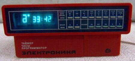 L’Elektronika 21-10 est construit autour de la même puce (KR1016VI1) que l’Elektronika 7-21, un réveil radio produit massivement dans plusieurs fabriques, ayant la possibilité de définir 16 programmes d’alarme. Mais ce modèle, le 21-10, avait en plus la possibilité qu’on lui connecte trois appareils électriques et que puisse programmer de les allumer et les éteindre à l’heure voulue.