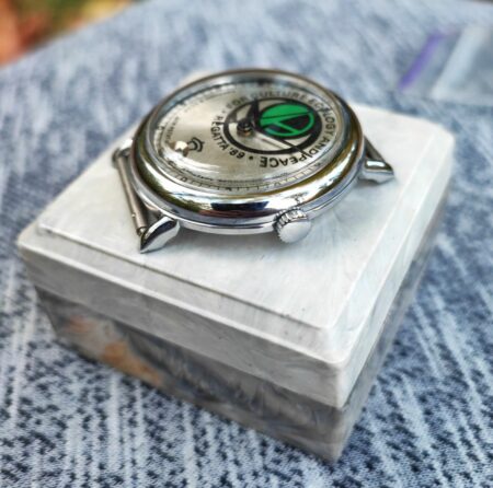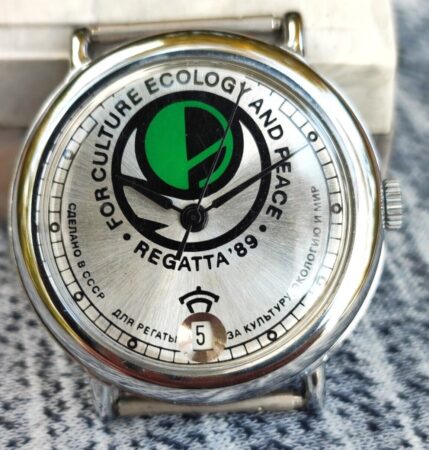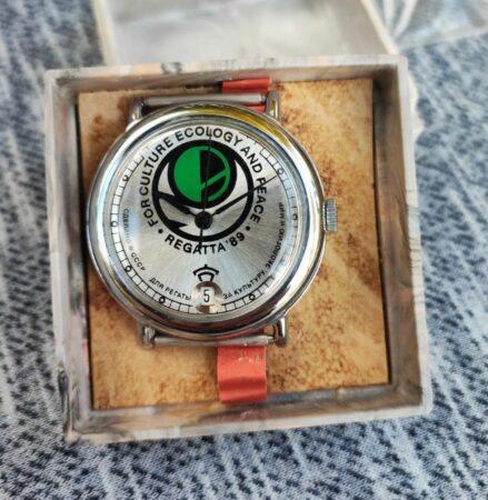 Mention « Régate 1989 pour la culture, l’écologie et la paix en anglais et en russe sur le cadran (« для регаты ’89 за культуру экологию и мир »).