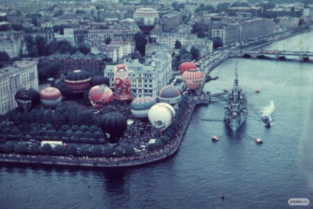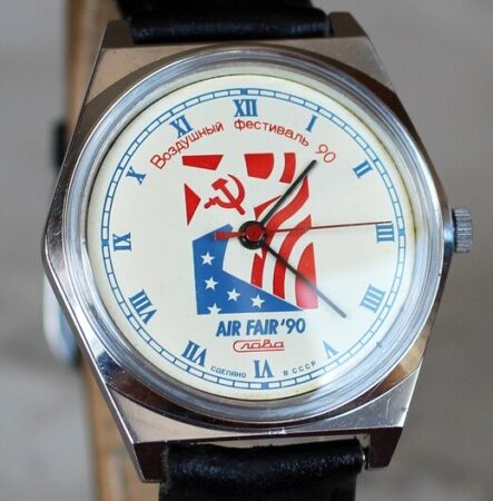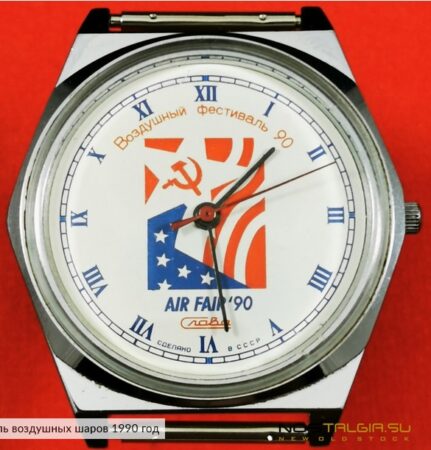 Montre produite à l’occasion du Festival aérien de 1990 à Léningrad (ici les montgolfières au bord de la Neva, près du croiseur Aurora):