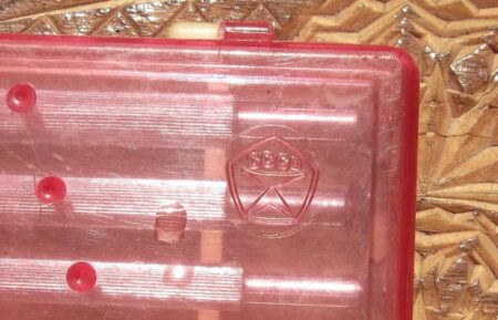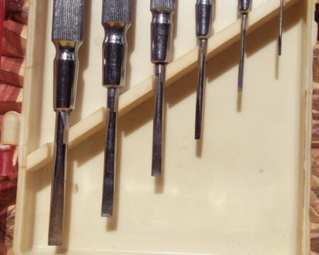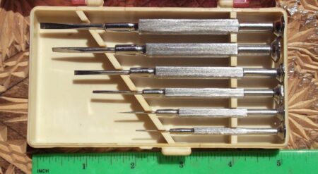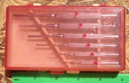 Une trousse en plastique à couvercle translucide teinté de six tournevis pour horlogers (et autres). Elle porte la marque de qualité de l’URSS et la marque ЧМД ou УМД .