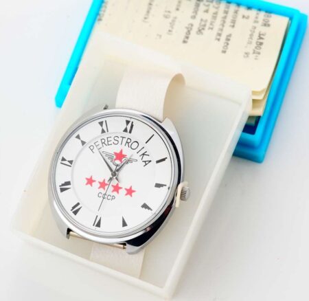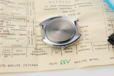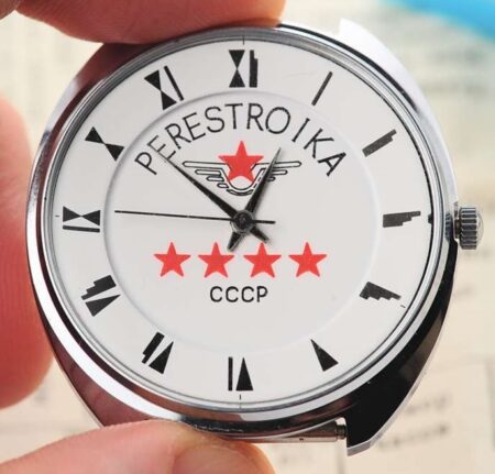 Montre bracelet commémorant la Perestroïka, pour l’export, à quartz, de la Fabrique de Montres de MinskMarque : Луч (Luch, « Rayon »)Boîtier de laiton chroméFond clipsé et gravé : 994Mécanisme : Luch 2356 à quartzMentions sur le calibre : L2356