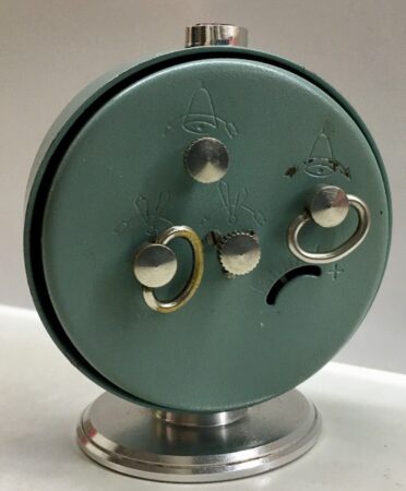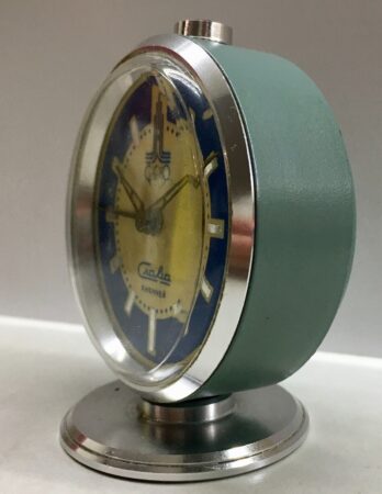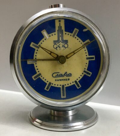 Petit réveil de marque de la 2e Fabrique de Montre de Moscou, célébrant les Jeux olympiques de Moscou de 1980 avec pour motif le logo des Jeux.Marque Slava, mécanisme 5671 à 11 rubis.Produit en 1979 ou 1980.