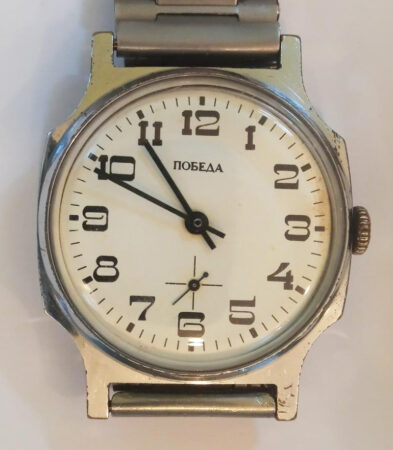 Cette Pobeda date de la période de transition: son cadran ne porte déjà plus le « fabriqué en URSS », mais pas encore le « Fabriqué en Russie ».