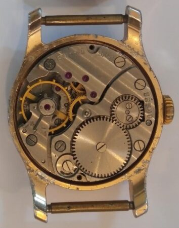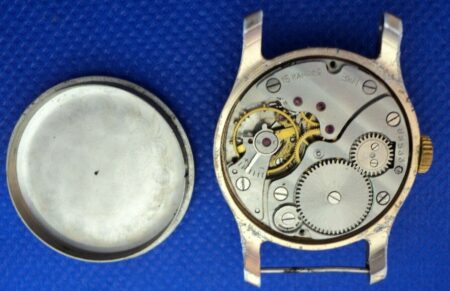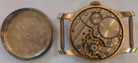 Remarque : Boîtier en aluminium doré, le mécanisme original (n°86533) a été remplacé par un autre de la même fabrique, du même modèle, de la même époque, avec les mêmes marquages etc.