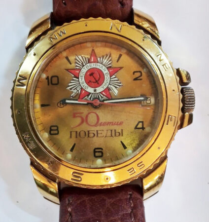 Cadran doré portant la mention 50 лет победы (50e anniversaire de la Victoire) et l’Ordre de la guerre Patriotique, décerné aux meilleurs combattant