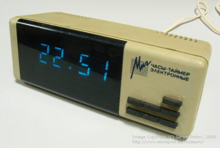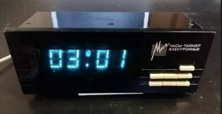 Ces horloges électroniques sont construites autour d’une puce KR145IK1901 utilisant un indicateur luminescent sous vide pour 4 digit.
