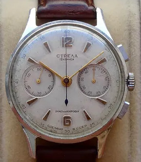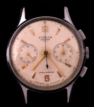 Chronographe de marque « Strela » de la 1ère Fabrique de Montres de Moscou produite pour l’exportation.