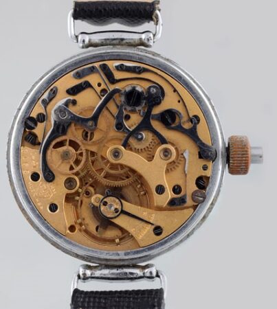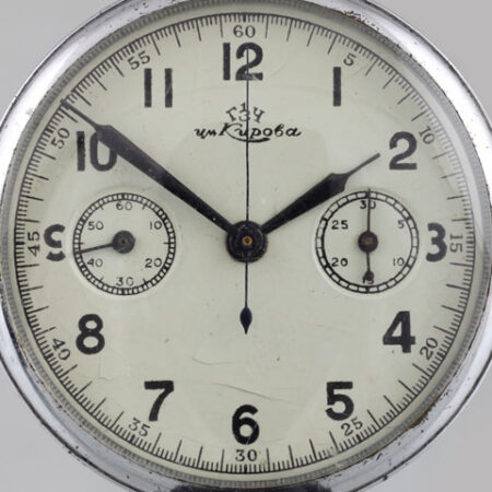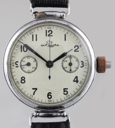 Chronographe à un bouton de la 1ère Fabrique de Montres de Moscou. Son calibre KChZ est en fait un Valjoux 61, assemblé en URSS à partir de pièces importées de Suisse.Produit le 1er trimestre 1941, n° de série 3165.