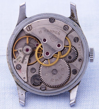 Mentions sur le calibre : n° de série (47504) sur un pont, logo de l’usine (initiales 1MЧЗ dans un losange) et 16 камней (16 rubis) sur un autre, ГC1MЧЗ et trois étoiles sur le rochet. Côtes de Genève.