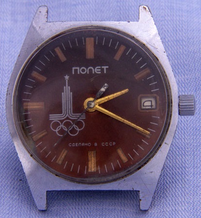 Montre-bracelet produite par la 1ère Fabrique de Montres de Moscou célébrant les Jeux olympiques de Moscou de 1980 avec le logo des Jeux.