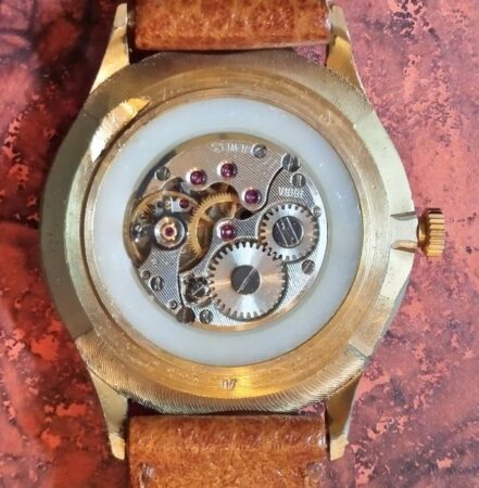 Mentions sur le calibre : 1601A et SU (pour Soviet Union) sur un pont, 17 jewels sur un autre, dernier logo Tchaïka (T dans un écu) sur la platine. Striures en guise de Côtes de Genève