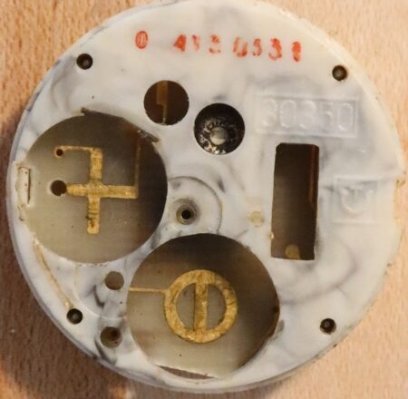 Mentions sur le calibre : 30350, logo de la fabrique Transistor de Minsk, chiffre tamponné en rouge