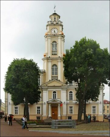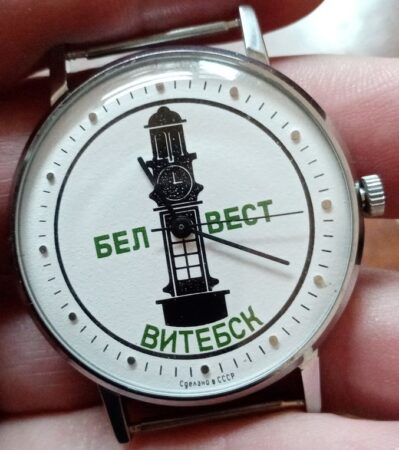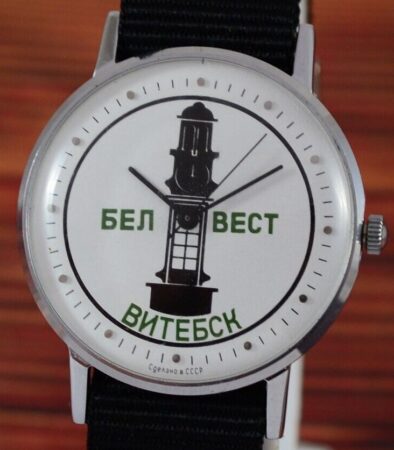 Sur le cadran figurent le nom de la fabrique Belwest (« белвест ») et de la ville de Vitebsk (« витебск ») et le clocher de l’hôtel de ville de Vitebsk (Biélorussie).