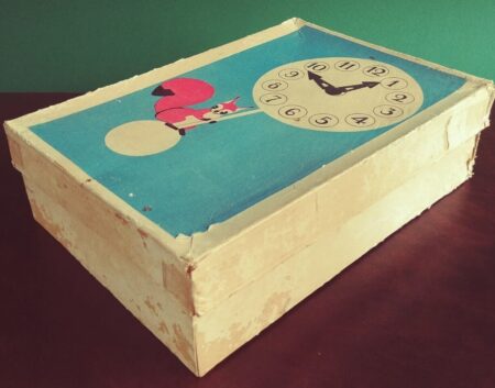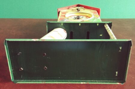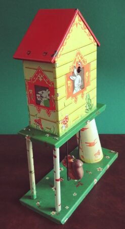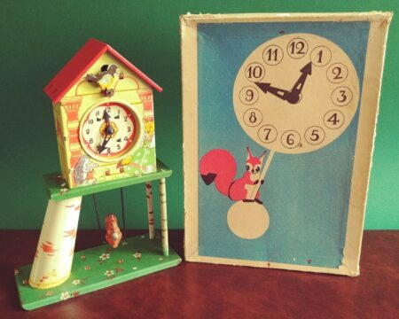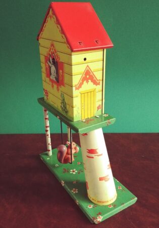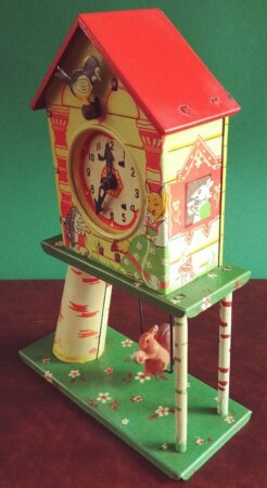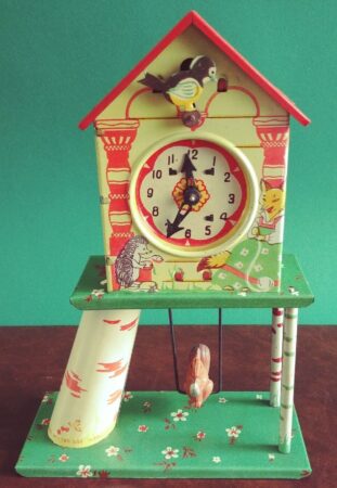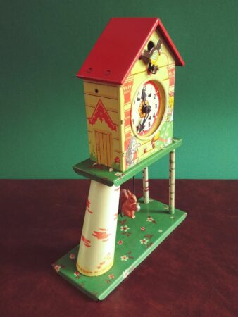 Jouet de fer blanc. Ce n’est pas une véritable horloge mais le remontoir actionne un mécanisme qui fait tourner les aiguilles (l’aiguilles des minutes avance d’un cran à chaque seconde), émet un tintement toutes les 10 secondes, fait bouger l’oiseau sur son perchoir et la balançoire de l’écureuil.
