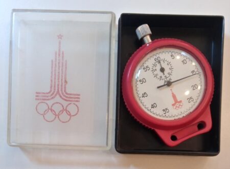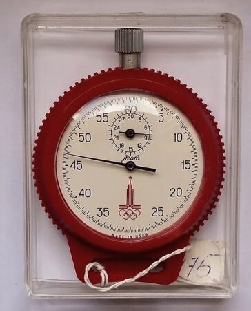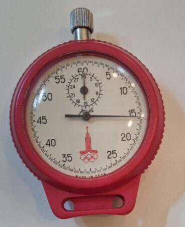 Chronomètre Agat à boîtier de plastique rouge au cadran célébrantg les Jeux olympiques de Moscou portant le logo des Jeux olympiques de Moscou., de la Fabrique de Montres de Zlatoust