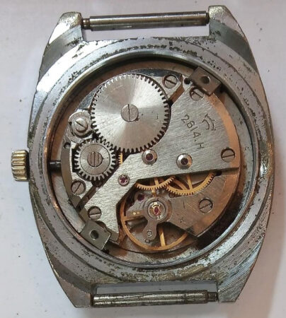 Mentions sur le calibre : n° de série sur la platine, 2614.H et logo Raketa sur le pont.