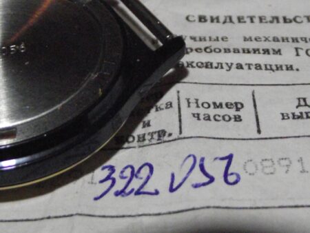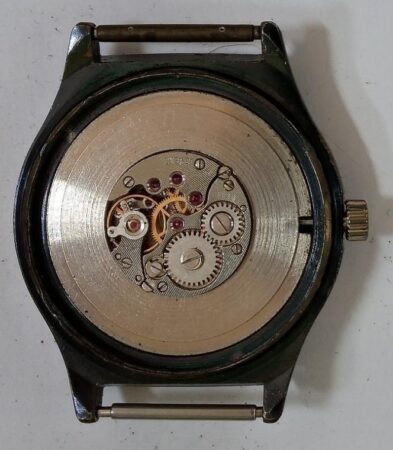 Mentions sur le calibre : 1601A et SU (pour Soviet Union) sur un pont, 17 jewels sur un autre, dernier logo Tchaïka (T dans un écu) sur la platine. Striures en guise de Côtes de Genève