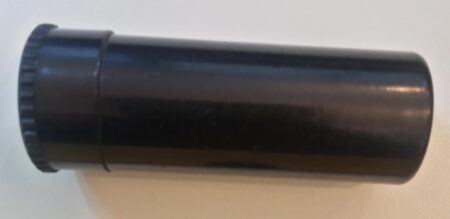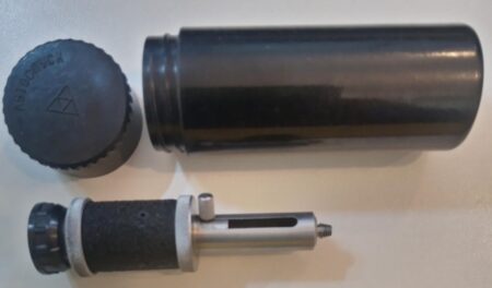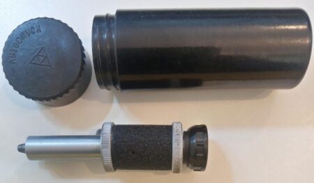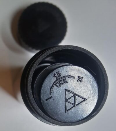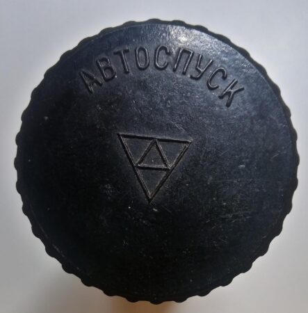 Son tube de rangement en bakélite noire porte la mention « автоспуск » (retardateur) avec un logo de triangle inscrit dans un autre.