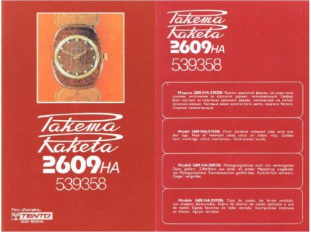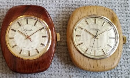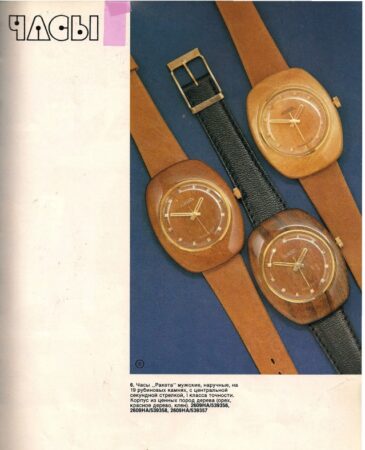 En Union soviétique, la seule usine qui a commencé à fabriquer des montres avec des boîtiers en bois au début des années 1980 était la Fabrique de Montres de Petrodvorets, sous la marque Raketa. Il n’est pas surprenant que ce soit Raketa, qui ai produit ce modèle en raison de sa tradition de production de montres et objets en matériaux précieux et semi-précieux (voir ici les Raketa en jade). Déclinée en trois modèles, la Raketa en bois fait une première apparition dans un catalogue de 1980: