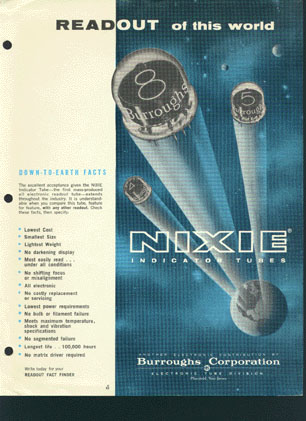 L’afficheur à tubes Nixie fut développé par un petit fabricant de tubes électroniques appelé Haydu Brothers Laboratories, et fut commercialisé en 1954 par Burroughs Corporation qui déposa la marque Nixie. Ce nom provient de l’abréviation « NIX I » utilisée chez Burroughs, et signifiant « Numeric Indicator eXperimental No. 1 ». Des composants similaires au fonctionnement semblable avaient été développés dans les années 1920, et les premiers tubes d’affichage produits en série avaient été diffusés à la fin des années 1930 par la société National Union Co. et Telefunken. Cependant, leur finition était moins aboutie, et ils ne purent trouver de débouchés conséquents jusqu’à ce que l’électronique numérique atteigne un niveau suffisant de développement dans les années 1950.